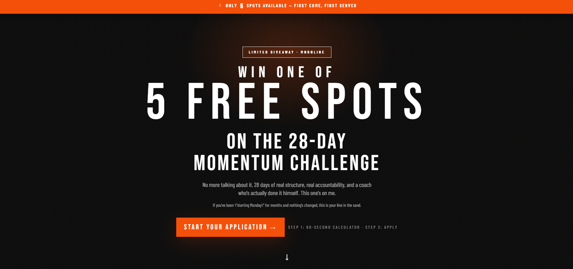 The 28 Day Momentum Challenge giveaway page, dark and orange with a sticky mobile CTA. Case study 02 · 2025